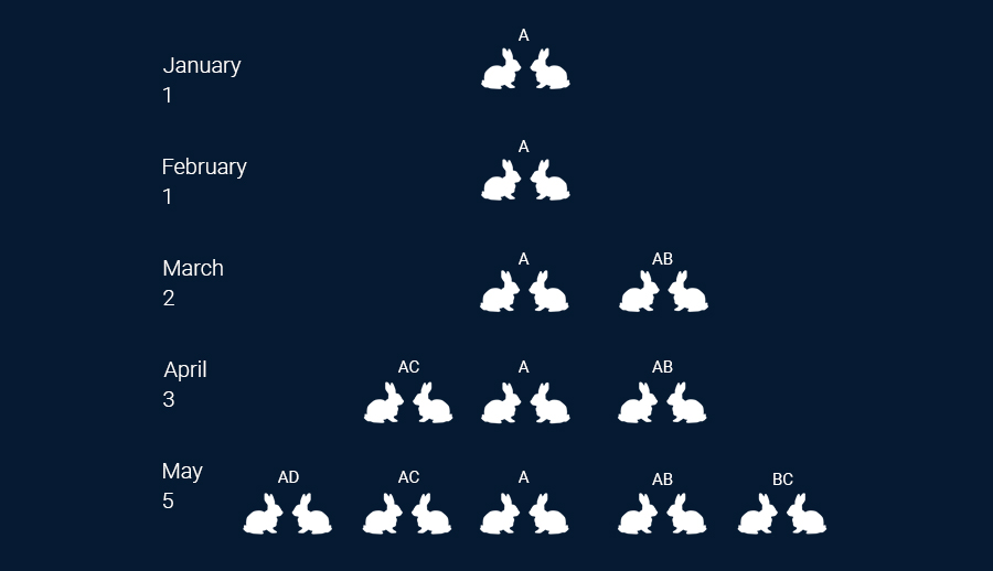 In his book Liber Abaci (Book of Calculation) he considered how many rabbits could be produced in a year if a pair is placed in a cage and each pair gives birth to a new pair every month (with the exception that each pair can only breed for the first time after two months). The calculation of the above question led to the Fibonacci sequence.