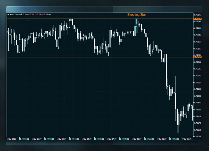 The shooting star is, in fact, an inverted hammer found near the top of the range by the resistance line. It’s a small body (black or white) with an upper shadow that’s 2-3 times the length of the body and has a lower shadow that’s tiny, or non-existent.