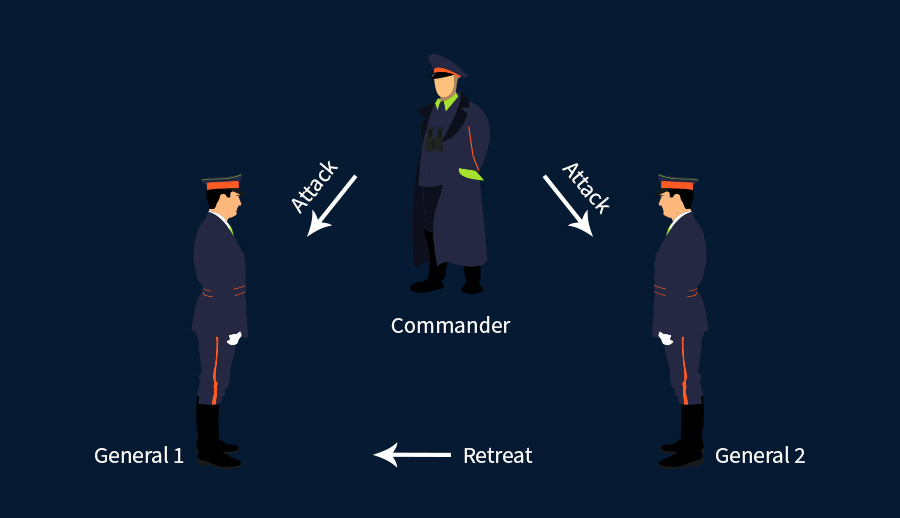 여러 명의 장군이 적군의 성을 포위했습니다. 이들은 사령관의 명령에 따라 공격 또는 후퇴해야 합니다. 작전이 성공하려면 장군들 사이에서 합의가 있어야 합니다. 사령관과 다른 장군들은 중간에 잡힐지도 모르는 전령을 통해 교신합니다. 게다가 사령관을 포함해 일부 장군들이 배신할 수도 있습니다. 사령관이 충직하고, 배신한 장군의 수가 전체의 1/3을 넘지 않는다면 공격 또는 후퇴에 대한 합의를 동시에 이룰 수 있습니다.