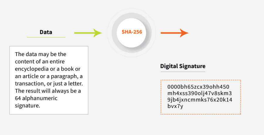 디지털 서명은 SHA-256 또는 double SHA-256로 알려진 수학 함수(즉, 암호학 해시 알고리즘)의 결과입니다(자세한 내용은 비트코인 키 및 주소 기사 참조). SHA-256이 데이터 파일을 받아들이고, 이 파일에 대해 암호화 알고리즘을 실행한 다음, 디지털 서명으로 알려진 64비트 문자열 출력을 생성합니다. 이 코드의 길이는 수신한 데이터 파일 길이와 상관 없이 항상 64자입니다.