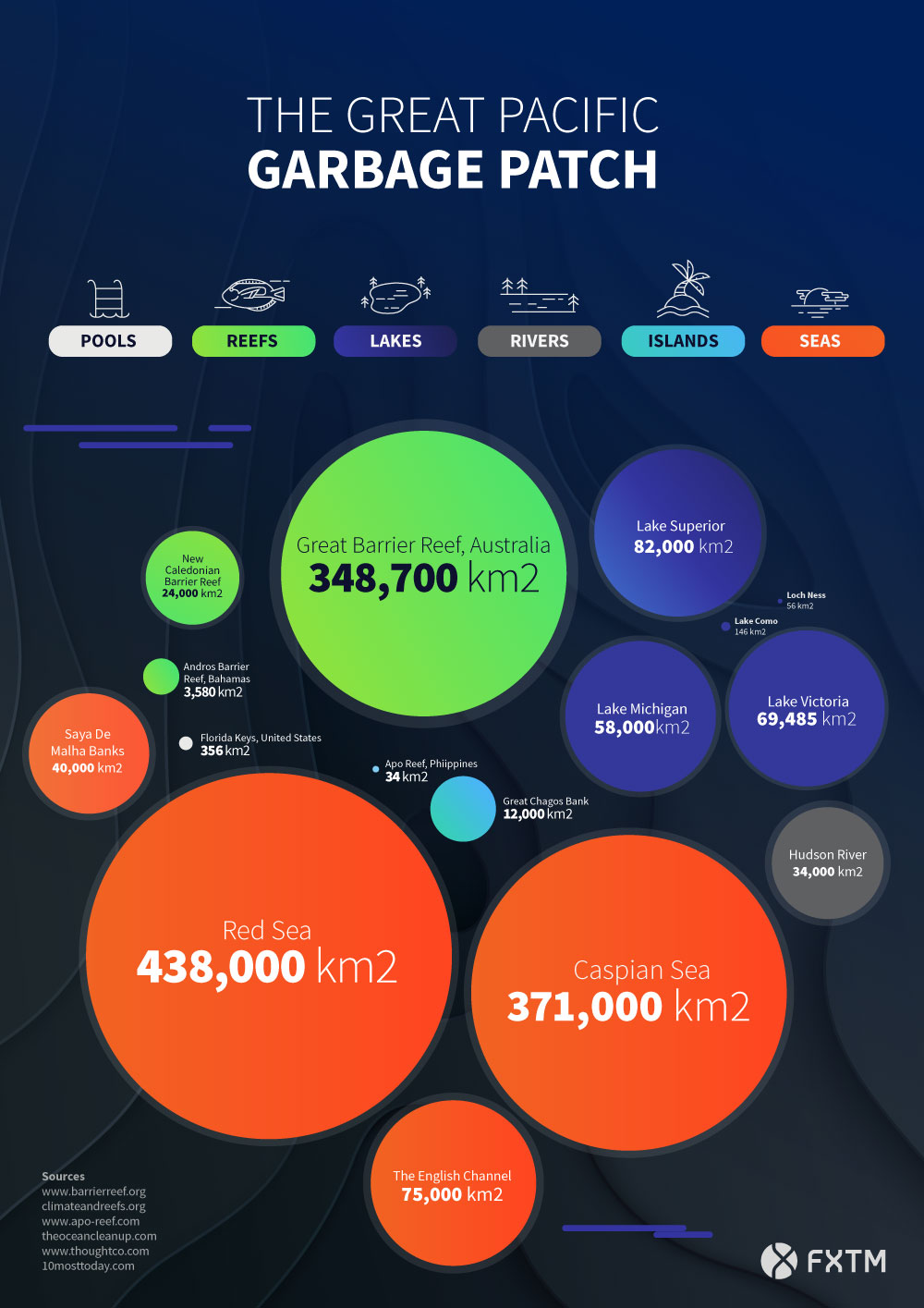 Here at FXTM, we’ve taken a closer look at what this gigantic garbage patch is made of, and the results are shocking. The patch is an enormous 1.6 million square kilometres in size, and filled with over 79,000 tonnes of plastic – that is approximately 250 pieces for every human being in the world!