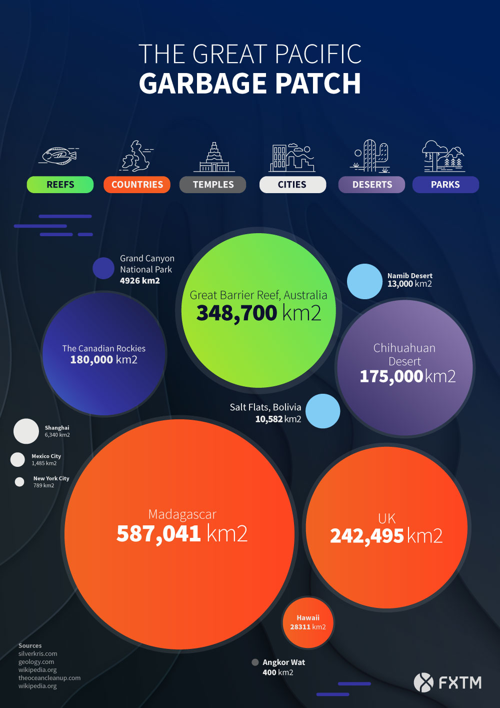 We’ve created an infographic in order to help you visualise just how big the Great Pacific Garbage Patch is. The whole of the UK, the Great Barrier Reef and the entirety of Madagascar – illustrated by circles on the infographic – can all fit comfortably inside of it, as can the Grand Canyon National Park, the Canadian Rockies, Hawaii, and the Chihuahuan Desert, to name a few.