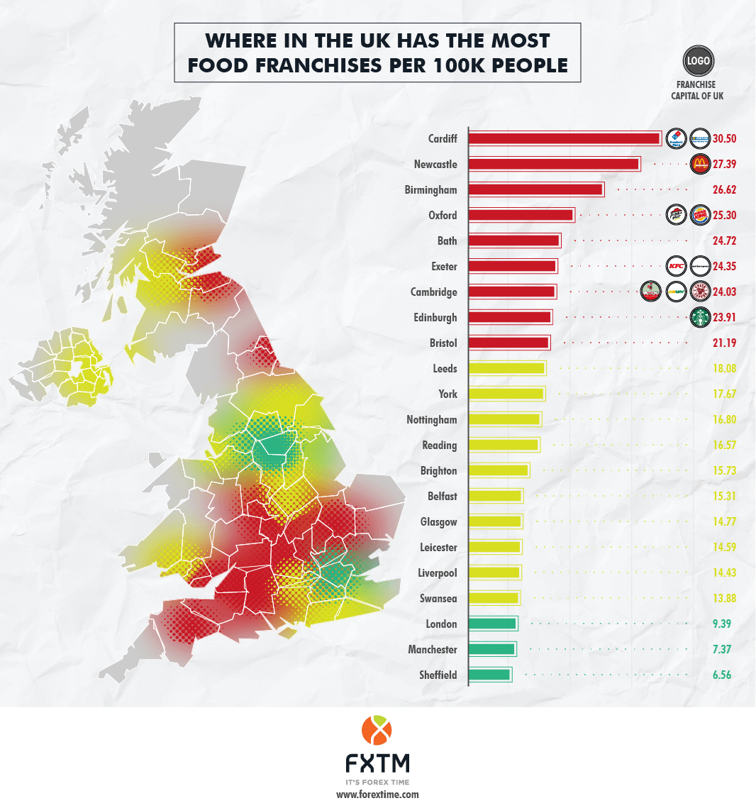 To visualise the domination of fast food restaurants around the UK, we took 16 fast food franchises and worked out how many of these restaurants operated in 22 cities across the UK.