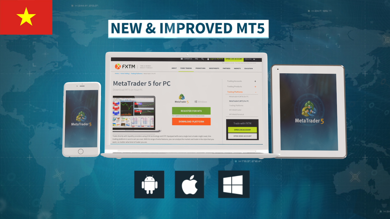 Nền tảng MT5 hiện đã sẵn có cho PC và Mac, cũng như các thiết bị sử dụng iOS và Android. Hãy giao dịch trên tài khoản của bạn trong khi bạn ở tại nơi làm việc hoặc đang di chuyển!
